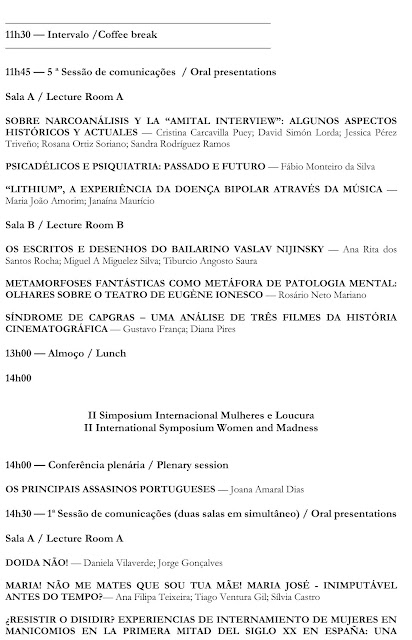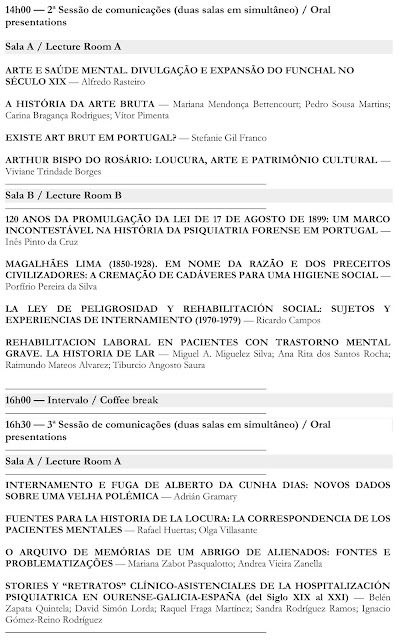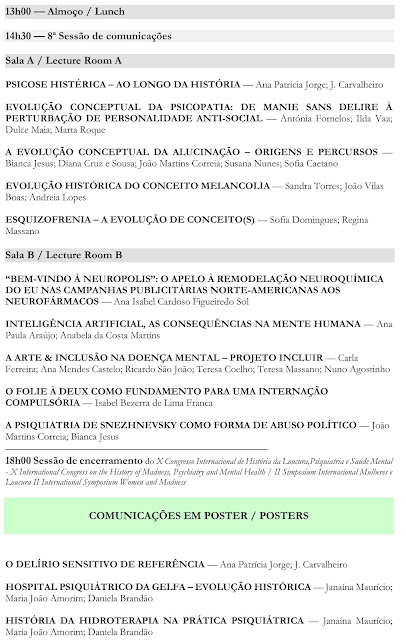 Após um pequeno intervalo para Coffee break, seguiu-se a primeira comunicação da 3.ª Sessão, Sala A, 16:30, subordinada ao tema «Psiquiatria Moderna: das influências do século XIX à transição no século XX», apresentada por José Alves Brás, Médico Interno de Psiquiatria do Centro Hospitalar da Universidade de Coimbra, mas em coautoria com Alexandre Duarte Mendes, Médico Psiquiatra do mesmo Centro Hospitalar. Segundo José Alves Brás, a Psiquiatria alcançou, no século XIX, atributos que a distinguem actualmente. Conquanto não tenha sido a especialidade pioneira a individualizar-se, as repercussões das enfermidades mentais estabeleceram diferenças relativamente a outras especialidades, pois eram diversos os tipos e locais de tratamento – mormente a instituição asilar. Nesta interessante comunicação foram abordadas a Medicina do século XIX, sendo que esta legou do precedente uma bifurcação entre os alienistas (dedicados aos “loucos” dos asilos públicos) e os outros clínicos (alocados a estâncias termais ou retiros privados para tratar as doenças “dos nervos”); as visões das patologias mentais; as diferentes escolas psiquiátricas; e a transição da Psiquiatria para o século XX, sendo que esta decorre numa postura de maturação enquanto disciplina e parte integrante da Medicina.